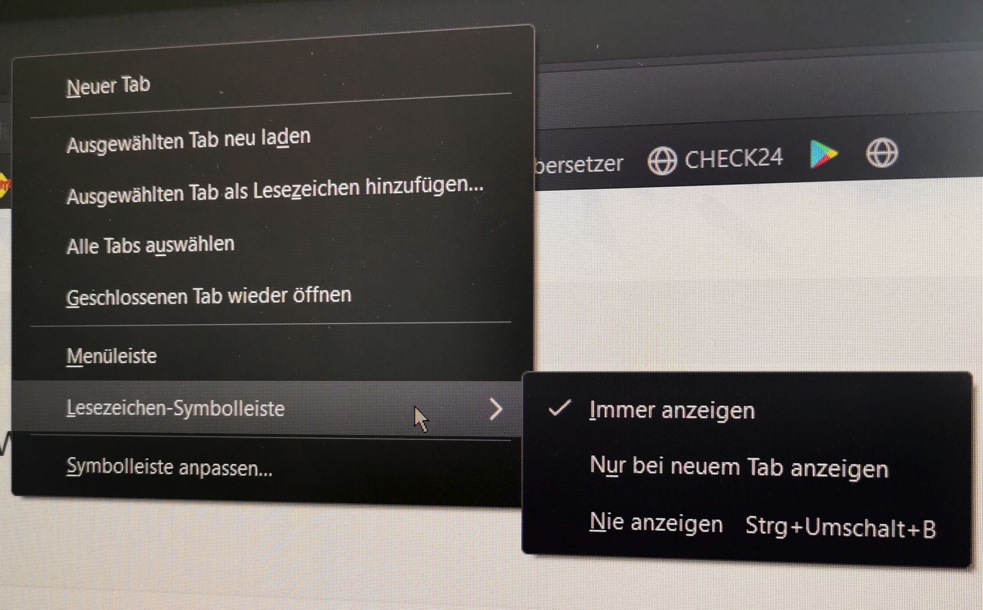 Mach mal ein Rechts-Klick in einem leeren Bereich neben den Datei-Menüs oder Tabs. Dann erscheint ein Menü-Übersicht - Unter Lesezeichen-Symbolleiste kann man dann einstellen, wie und wann die Lesezeichen-Symbolleiste erscheinen soll.