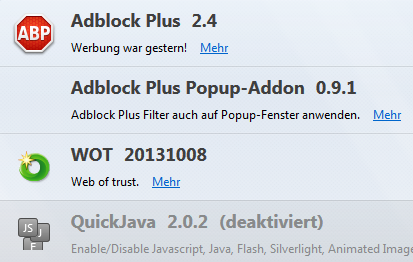 Ich weiß nicht mehr genau, wo ich es heruntergeladen habe. Wahrscheinlich aber direkt bei Mozilla. Oder bei CHIP.de Habe aber heute die Erweiterungen Adblock plus und WOT hinzugefügt. WOT Ist wieder aufgetaucht. Aber wo vorher das Adblock Icon war ist jetzt das QJ Icon. JAVA Quick ist aber deaktiviert.
