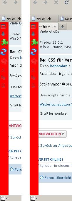 Super, jetzt ist es wirklich wie ich es haben will :klasse:Ich habe kurz überlegt.. Die Originaltoolbar passt sich oben in der Höhe an, sobald eine Reihe mehrzeiliger Tabs beginnt. Durch den CSS-Code steht sie dann etwas über (siehe Bild: links einzeilige Tabreihe, rechts mehrzeilig mit Überstand; ich habe die Leiste mal rot gefärbt, damit man es besser erkennt). Das ist aber wahrscheinlich sogar sinnvoll so, weil bei einer Autoanpassung der Höhe, die Leiste ja verkürzt werden müsste. Das wäre sicherlich auch nicht ideal, wenn viele Buttons drin sind, denn die müssten dann ja auch irgendwo hingequetscht werden. Also, das passt nun wie es ist. Nochmal vielen Dank :klasse: