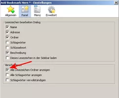 mein Hauptgrund für diese Anfrage war ein Bug in Add Bookmark Here ², wodurch das Ausklappen nicht mehr einwandfrei funktionierte. Der Bug ist behoben und es geht wieder. Dazu muss in den ABH²-Einstellungen ein Häkchen bei "Alle Lesezeichen-Ordner anzeigen" gesetzt werden. Eine andere Lösung weiß ich leider auch nicht.