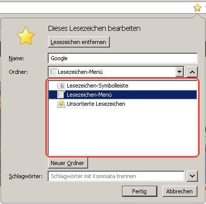 Ich habe früher auch mit den zuletzt benutzten Ordnern gearbeitet und bin dann irgendwann auf Add Bookmark Here ² umgestiegen. Man muss es erstmal einstellen, aber mittlerweile möchte ich es nicht mehr missen.. Das Addon braucht es aber garnicht unbedingt. Du könntest auch mal versuchen, statt der letzten fünf Ordner mal den ganzen Ordnerbaum zu öffnen und zu benutzen. Nach einer kurzen Umgewöhnugsphase ist das vielleicht garnicht mal so schlecht. Ich benutze ihn mittlerweile wie gesagt (plus Add Bookmark Here ²). Wie man die Größe des Baumfensters ändert, habe ich erst vor ein paar Tagen hier im Forum gefragt -> Bookmark-Panel: Höhe des Foldertree-Bereichs ändern.