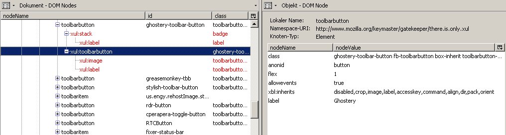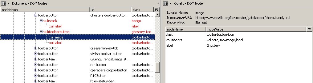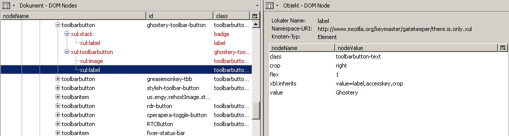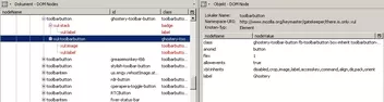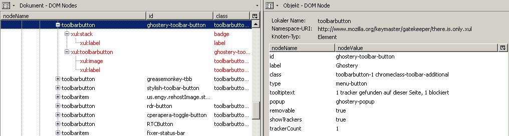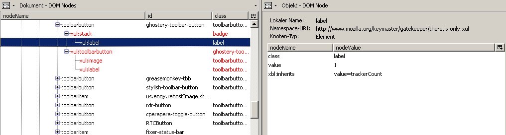 ich würde gern eine Änderung am Add-on-Leistensymbol von Ghostery vornehmen. Das Symbol besteht aus einem blauen Gespenst und einer variablen Zahl. Die Zahl verändert sich abhängig von den auf einer Webseite gefundenen Trackern (im Beispielbild unten: 2 Tracker) und verschwindet gänzlich, wenn 0 Tracker gefunden wurden. Das bedeutet eine Menge "Bewegung" in der Add-on-Leiste, von der mir lieber wäre, es gäbe sie nicht. Kurz gesagt, ich würde das Feld mit der Zahl gern komplett deaktivieren. Ich hänge im folgenden mal einige Screenshots an, zuerst vom Symbol selbst und dann von den DOM Node-Einträgen im DOM Inspector: