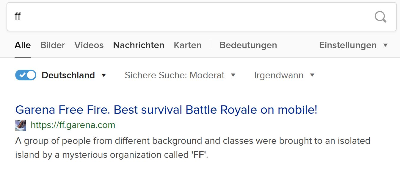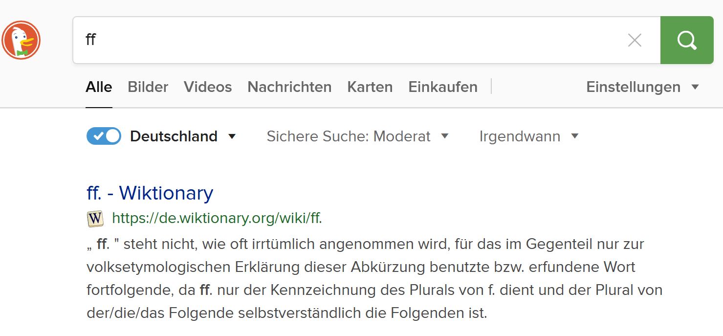 ich habe Duckduckgo als Standardsuchmaschine eingestellt, sowie dass nur in Deutschland gesucht wird (eine Einstellung im Duckduckgo). Wenn ich nun in der Suchleiste nach z.B. "ff" suche, werden mir englische Webseiten angezeigt - wenn ich die gleiche Suche über die Adressleiste ausführe, werden deutsche Webseiten dann angezeigt.