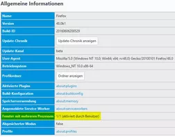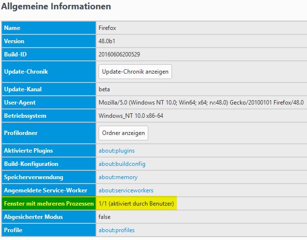 Bin nach https://wiki.mozilla.org/Electrolysis vorgegangen und habe "...If you're currently using Firefox Beta you might be testing e10s already, check about:support and look for a number higher than 0 in the "Multiprocess Windows" entry. If you would like to opt-in to help us test open about:config and toggle browser.tabs.remote.autostart to true. On your next restart, e10s should be active." aktiviert.