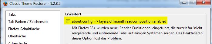 Sören hatte das Phänomen und den von mir beschriebenen Schritt vor längerem hier beschrieben: https://www.soeren-hentzschel.at/mozilla/firefo…ox-33-probleme/.