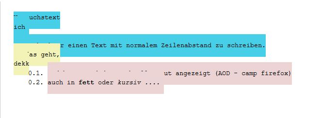 seit einer Etherpad-Nutzung vor einigen Wochen kann ich Etherpad-Texte, die ich selber geschrieben habe (ich meine auf https://public.etherpad-mozilla.org/) nicht mehr richtig darstellen (s.u.). Ich fürchte, ich habe damals irgendeine Tastenkombination mit Strg gedrückt, und zwar mehrmals (ich wollte wohl Strg u.+ drücken, glaube ich), und seitdem ist das so. Es muss am Firefox liegen (aktuellste Version auf Windows 7) denn im Internet Explorer sehen die Texte ganz normal aus.
