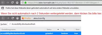 Bildschirmfoto Firefox Quantum 57.0 accessibility.blockautorefresh mit Wert true eingestellt.