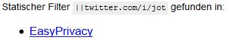 http://twitter.com/i/jot für das erfolgreiche blockieren zuständig. Adresse: https://easylist.to/easylist/easyprivacy.txt / Gruß, der_nachdenklicher -