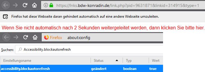 Adresse: about:config?filter=Accessibility.blockautorefresh auf Standard Wert false Umschalten.
