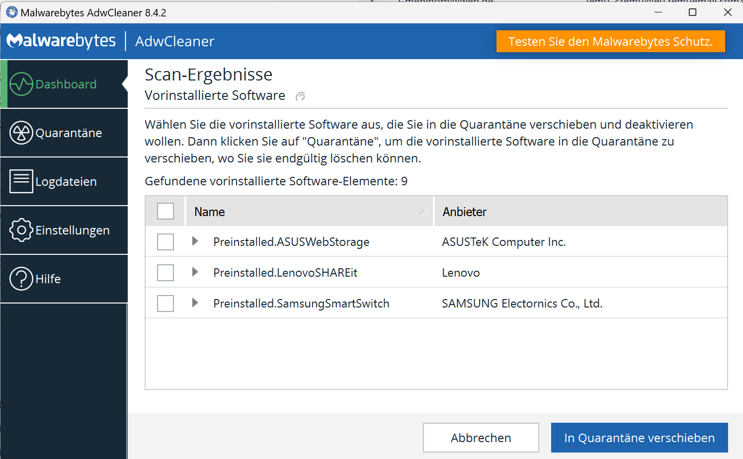 Alles anzeigen# ------------------------------- # Malwarebytes AdwCleaner 8.4.2.0 # ------------------------------- # Build: 03-04-2024 # Database: 2024-10-23.4 (Cloud) # Support: https://www.malwarebytes.com/support # # ------------------------------- # Mode: Clean # ------------------------------- # Start: 12-05-2024 # Duration: 00:00:05 # OS: Windows 11 (Build 22631.4541) # Cleaned: 46 # Failed: 0 ***** [ Services ] ***** No malicious services cleaned. ***** [ Folders ] ***** Deleted C:\Program Files (x86)\Common Files\IObit\Advanced SystemCare Deleted C:\Program Files (x86)\IObit\Advanced SystemCare Deleted C:\Program Files (x86)\Lavasoft\Web Companion Deleted C:\ProgramData\Application Data\Lavasoft\Web Companion Deleted C:\ProgramData\Bit Guardian Deleted C:\ProgramData\Digital Protection Services S.R.L Deleted C:\ProgramData\IObit\Advanced SystemCare Deleted C:\ProgramData\Lavasoft\Web Companion Deleted C:\ProgramData\Microsoft\Windows\Start Menu\Programs\Advanced SystemCare Deleted C:\ProgramData\Microsoft\Windows\Start Menu\Programs\Lavasoft\WebCompanion Deleted C:\Users\xxx\AppData\LocalLow\IObit\Advanced SystemCare Deleted C:\Users\xxx\AppData\Local\Lavasoft\WEBCOMPANION.EXE_URL_MRPQ523XMEO0CM2M0N5VJ25Z3NZKGEP4 Deleted C:\Users\xxx\AppData\Roaming\IObit\Advanced SystemCare Deleted C:\Users\xxx\AppData\Roaming\Lavasoft\Web Companion Deleted C:\Windows\SysWOW64\config\systemprofile\AppData\Roaming\IObit\Advanced SystemCare ***** [ Files ] ***** Deleted C:\Users\xxx\AppData\Roaming\Mozilla\Firefox\Profiles\au1shw26.default-release\searchplugins\My Firefox Search.xml ***** [ DLL ] ***** No malicious DLLs cleaned. ***** [ WMI ] ***** No malicious WMI cleaned. ***** [ Shortcuts ] ***** No malicious shortcuts cleaned. ***** [ Tasks ] ***** No malicious tasks cleaned. ***** [ Registry ] ***** Deleted HKCU\SOFTWARE\27ce9fa05c3947dc99ac7a6bd52f3e16 Deleted HKCU\SOFTWARE\438f84b93ab73e6e9ccd233d1abe724b Deleted HKCU\Software\Bit Guardian Deleted HKCU\Software\IObit\Advanced SystemCare Deleted HKCU\Software\Lavasoft\Web Companion Deleted HKCU\Software\Microsoft\Windows\CurrentVersion\Explorer\StartupApproved\Run|Web Companion Deleted HKCU\Software\Microsoft\Windows\CurrentVersion\Internet Settings\ZoneMap\Domains\webcompanion.com Deleted HKLM\SOFTWARE\CLASSES\DIRECTORY\SHELLEX\CONTEXTMENUHANDLERS\Advanced SystemCare Deleted HKLM\SOFTWARE\CLASSES\DRIVE\SHELLEX\CONTEXTMENUHANDLERS\Advanced SystemCare Deleted HKLM\SOFTWARE\CLASSES\LNKFILE\SHELLEX\CONTEXTMENUHANDLERS\Advanced SystemCare Deleted HKLM\SOFTWARE\Classes\*\shellex\ContextMenuHandlers\Advanced SystemCare Deleted HKLM\SOFTWARE\Classes\CLSID\{645FF040-5081-101B-9F08-00AA002F954E}\shellex\ContextMenuHandlers\Advanced SystemCare Deleted HKLM\Software\Bit Guardian Deleted HKLM\Software\Classes\CLSID\{2803063F-4B8D-4dc6-8874-D1802487FE2D} Deleted HKLM\Software\Classes\Interface\{BA935377-E17C-4475-B1BF-DE3110613A99} Deleted HKLM\Software\Classes\TypeLib\{60AD0991-ECD4-49DC-B170-8B7E7C60F51B} Deleted HKLM\Software\Wow6432Node\IOBIT\ASC Deleted HKLM\Software\Wow6432Node\IObit\Advanced SystemCare Deleted HKLM\Software\Wow6432Node\IObit\RealTimeProtector Deleted HKLM\Software\Wow6432Node\Lavasoft\Web Companion Deleted HKLM\Software\Wow6432Node\Microsoft\Windows\CurrentVersion\Uninstall\{803055d7-de04-4feb-8820-5085e56297ae}|DisplayIcon Deleted HKLM\Software\Wow6432Node\Microsoft\Windows\CurrentVersion\Uninstall\{803055d7-de04-4feb-8820-5085e56297ae}|DisplayName Deleted HKLM\Software\Wow6432Node\\Classes\Interface\{BA935377-E17C-4475-B1BF-DE3110613A99} Deleted HKLM\Software\Wow6432Node\\Classes\TypeLib\{60AD0991-ECD4-49DC-B170-8B7E7C60F51B} Deleted HKLM\Software\Wow6432Node\\Microsoft\Windows\CurrentVersion\Uninstall\Advanced SystemCare_is1 Deleted HKLM\Software\qdu-pr Deleted HKU\.DEFAULT\Software\Microsoft\Windows\CurrentVersion\Internet Settings\ZoneMap\Domains\webcompanion.com Deleted HKU\S-1-5-18\Software\Microsoft\Windows\CurrentVersion\Internet Settings\ZoneMap\Domains\webcompanion.com ***** [ Chromium (and derivatives) ] ***** No malicious Chromium entries cleaned. ***** [ Chromium URLs ] ***** No malicious Chromium URLs cleaned. ***** [ Firefox (and derivatives) ] ***** No malicious Firefox entries cleaned. ***** [ Firefox URLs ] ***** Deleted My Firefox Search Deleted My Firefox Search ***** [ Hosts File Entries ] ***** No malicious hosts file entries cleaned. ***** [ Preinstalled Software ] ***** No Preinstalled Software cleaned. ************************* [+] Delete Tracing Keys [+] Reset Winsock ************************* AdwCleaner[S00].txt - [2824 octets] - [26/01/2023 09:07:46] AdwCleaner[C00].txt - [2546 octets] - [26/01/2023 09:14:04] AdwCleaner[S01].txt - [2229 octets] - [13/02/2023 10:41:27] AdwCleaner[C01].txt - [1920 octets] - [13/02/2023 10:41:59] AdwCleaner[S02].txt - [4011 octets] - [23/03/2023 12:29:33] AdwCleaner[C02].txt - [3451 octets] - [23/03/2023 12:30:18] AdwCleaner[S03].txt - [6172 octets] - [27/04/2023 14:36:56] AdwCleaner[S04].txt - [7677 octets] - [12/07/2023 09:41:26] AdwCleaner[C04].txt - [5655 octets] - [12/07/2023 09:42:56] AdwCleaner[S05].txt - [3776 octets] - [21/08/2023 09:05:41] AdwCleaner[C05].txt - [2400 octets] - [21/08/2023 09:13:33] AdwCleaner[S06].txt - [7434 octets] - [05/12/2024 16:12:39] ########## EOF - C:\AdwCleaner\Logs\AdwCleaner[C06].txt ##########Edit 2002Andreas:
