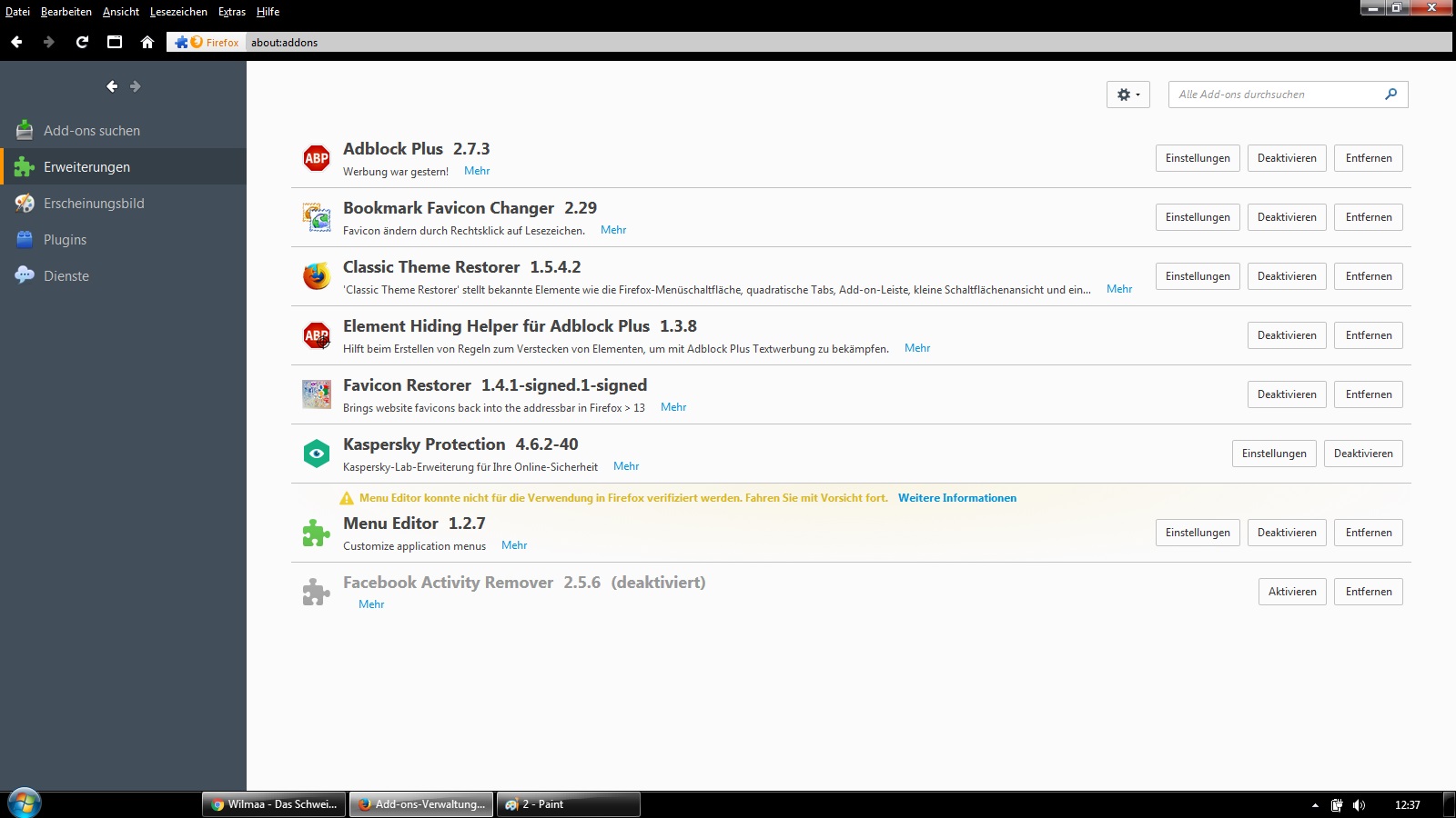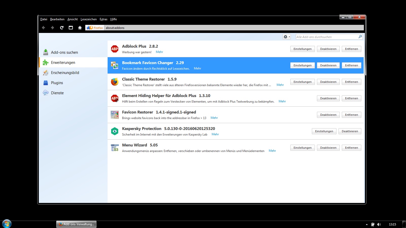 habe die neueste FF-Version und Kaspersky Internet Security 2015. Unter "Erweiterungen" erscheinen einige Kaspersky Add-Ons, welche sich allerdings nicht deaktivieren lassen. Nun erscheinen ständig zwei Icons rechts von der Browserzeile, die ich gerne weghaben möchte.