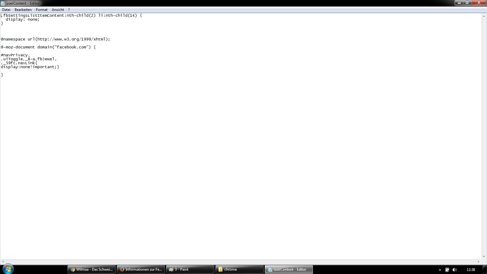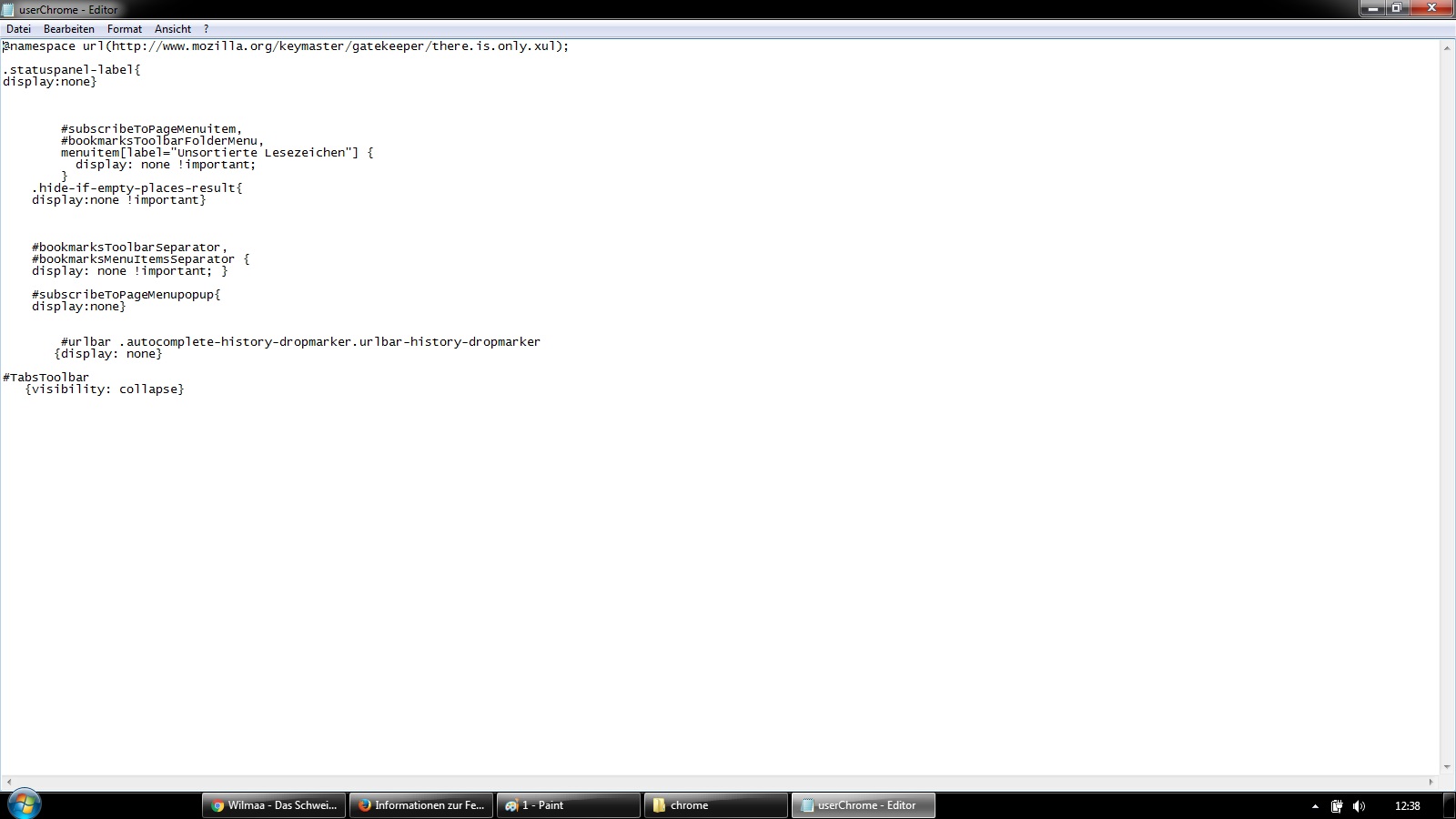 Alles anzeigen@namespace url(http://www.mozilla.org/keymaster/gatekeeper/there.is.only.xul); .statuspanel-label{ display:none} #subscribeToPageMenuitem, #bookmarksToolbarFolderMenu, menuitem[label="Unsortierte Lesezeichen"] { display: none !important; } .hide-if-empty-places-result{ display:none !important} #bookmarksToolbarSeparator, #bookmarksMenuItemsSeparator { display: none !important; } #subscribeToPageMenupopup{ display:none} #urlbar .autocomplete-history-dropmarker.urlbar-history-dropmarker {display: none} #TabsToolbar {visibility: collapse} -