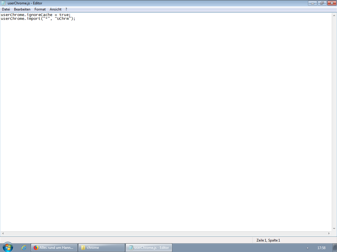 Habe dann den Code aus Beitrag 2 hineinkopiert- gespeichert-FF geschlossen-geöffnet...und..es hat nicht funktioniert..