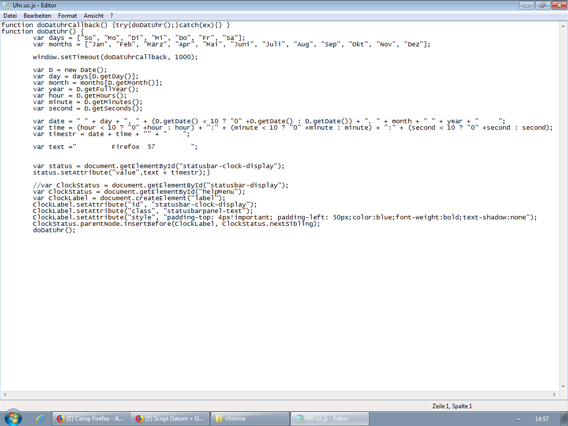 In der Datei userChrome.js (unter Chrome) muß doch jetzt der Code hinein der Uhrzeit/Datum anzeigt, richtig..?