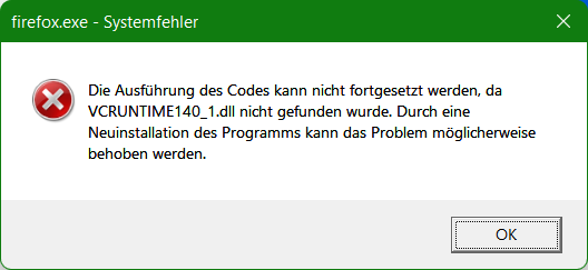 Bei der NEUInstallation kommt tatsächlich die von Userseite erwähnte Fehlermeldung vcruntime140_1.dll