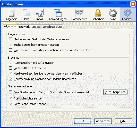 Deinem Vorschlag folgend, habe ich nun die angefragten Einstellungen angesehen, hier die Netzwerk-Einstellungen des FF, sie sind übrigens im Normalmodus und abgesicherten Modus gleich