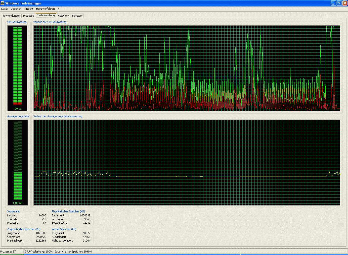 (Die Zickzacklinie im Verlauf der Auslagerungsdatei am Anfang ergibt die periodische 100% Auslastung)