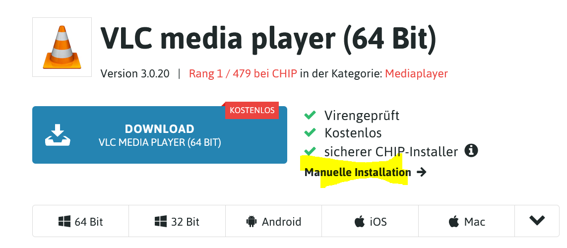 Ich erwähnte der Vollständigkeit oder Fairnis halber, dass die aber auch "unverseuchte" Downloads anbieten, nur (m.E.!) viel zu unauffällig, hinter den verseuchten Angeboten deutlich zurückstehend (und wenig bekannt). Könnte man so stehen lassen und als nachprüfbare Tatsache akzeptieren, aber man kann natürlich auch mit einem weiteren aber wieder auf Anfang gehen, dass Chip.de Mist ist oder viel Mist baut.