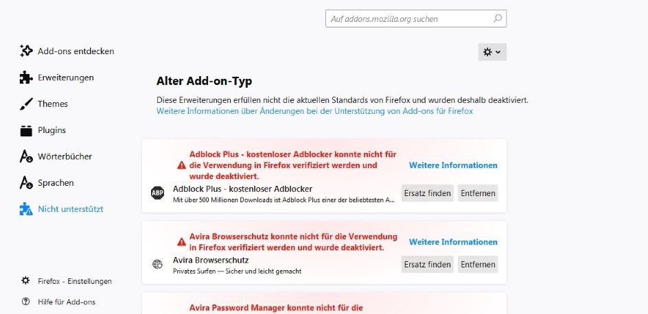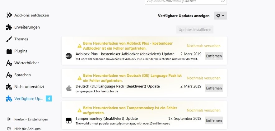 Ich habe seit heute Morgen das selbe Problem. IEs kam vorhin eine Meldung, dass die Add-ons nicht mehr unterstützt werden. Ein Update ist nicht möglich, auch eine erneute Installation funktioniert nicht. Siehe auch die angehängten Bilder.