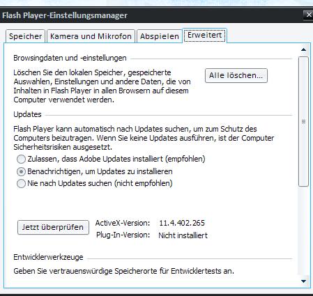 Den hatte ich ja vorher bereits installiert. Das ist ja das komische. In Software wird er mir auch angezeigt aber in dem Flashplayermenü der Systemsteuerung nicht