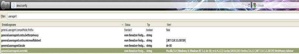 Im Anhang seht ihr was Firefox im safemode unter about:config mit dem Filter useragent anzeigt.