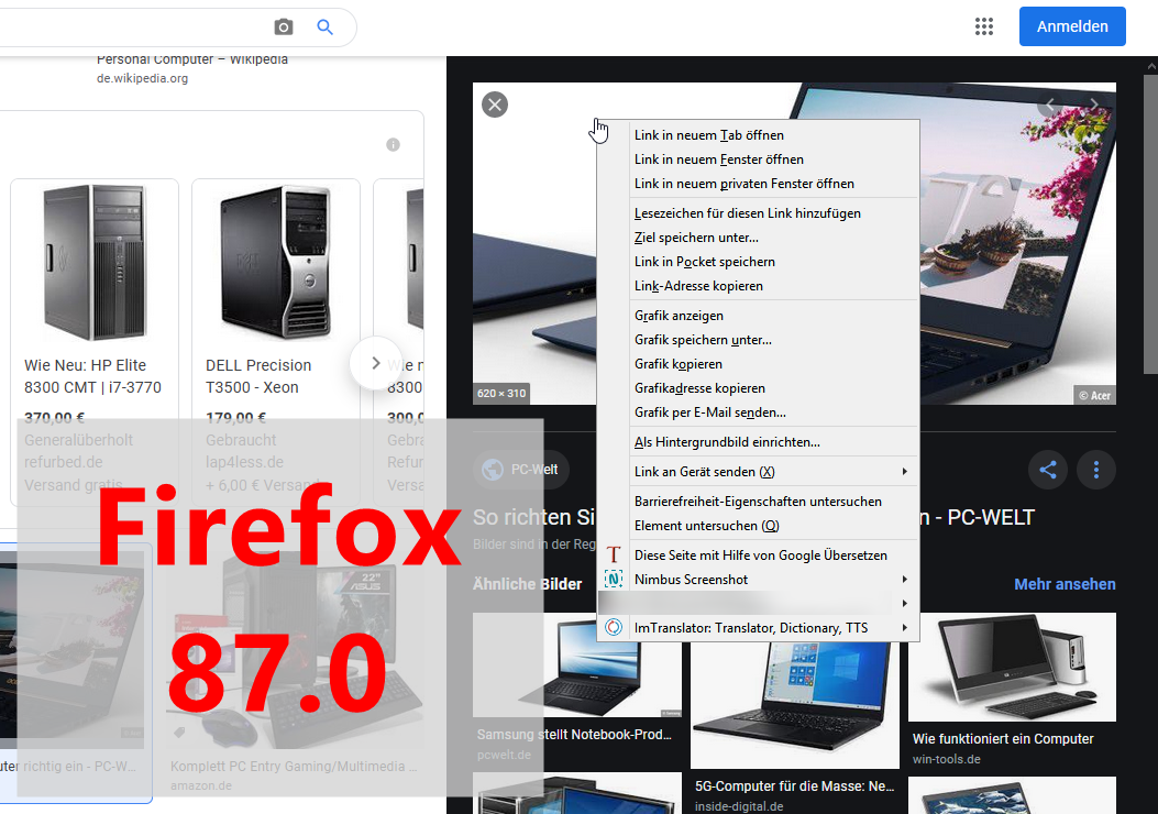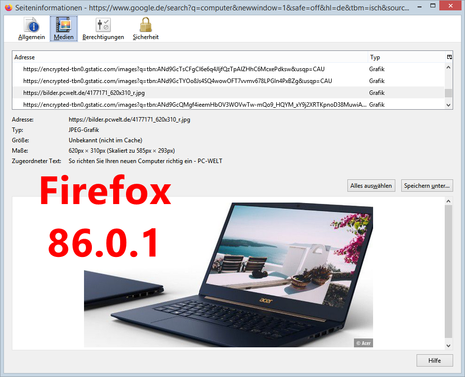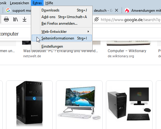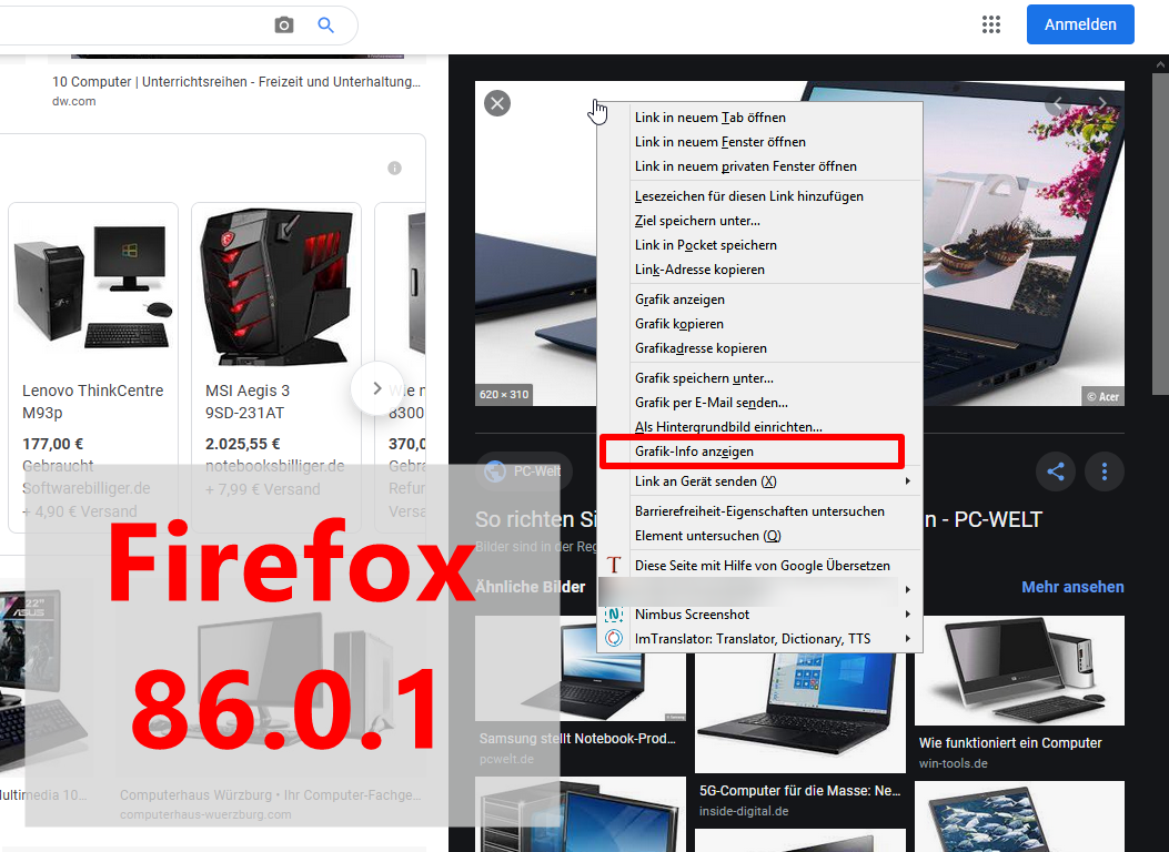 Soweit so gut.... bis Firefox 86.0.1 konnte ich noch mit einem Rechtsklick auf das vergrößerte Bild im rechten Bereich den Eintrag "Grafik-Info anzeigen" auswählen und es öffnete sich ein separates Fenster mit nützlichen Infos (Seiteninformationen). Man kann zwar über das Menü "Extras" auch den Punkt "Seiteninformationen" anklicken, aber dann bekommt man nur die Infos von den kompletten Suchergebnissen und nicht von diesem einzelnen Bild. Seit der Firefox-Version 87.0 ist der Eintrag "Grafik-Info anzeigen" im Kontextmenü nicht mehr vorhanden.
