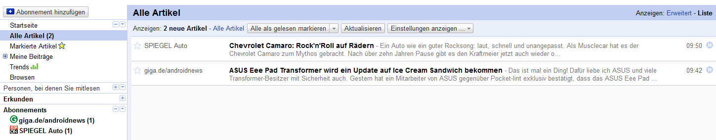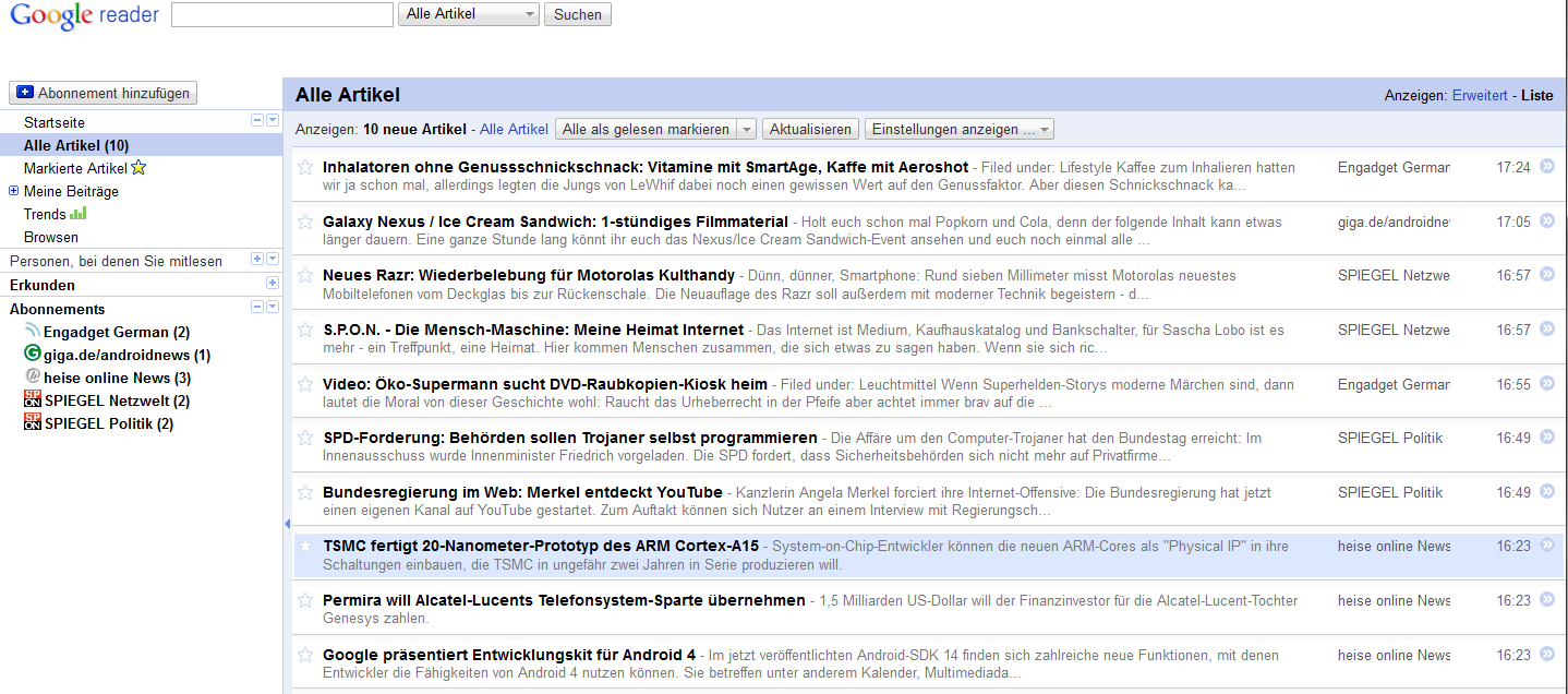 Kleiner Nachteil: Bei E-Mails sind die E-Mails direkt sichtbar, beim Google Reader ist es etwas anders: Links in der Liste der Feeds sehe ich auf der Seite dann auch die neuen Artikel angezeigt, rechts erscheinen die neuen Artikel aber nicht automatisch, sondern es muss links nochmal auf "Alle Artikel" oder den gewünschten Feed geklickt werden. Oder F5, dann lädt die Seite aber komplett neu, dauert länger.