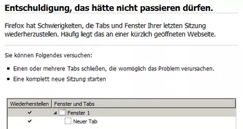 Das Problem mit about:blank, welches zu diesem "Entschuldigung..."-Bildschirm führt, ist ein bekanntes: https://bugzilla.mozilla.org/show_bug.cgi?id=853779