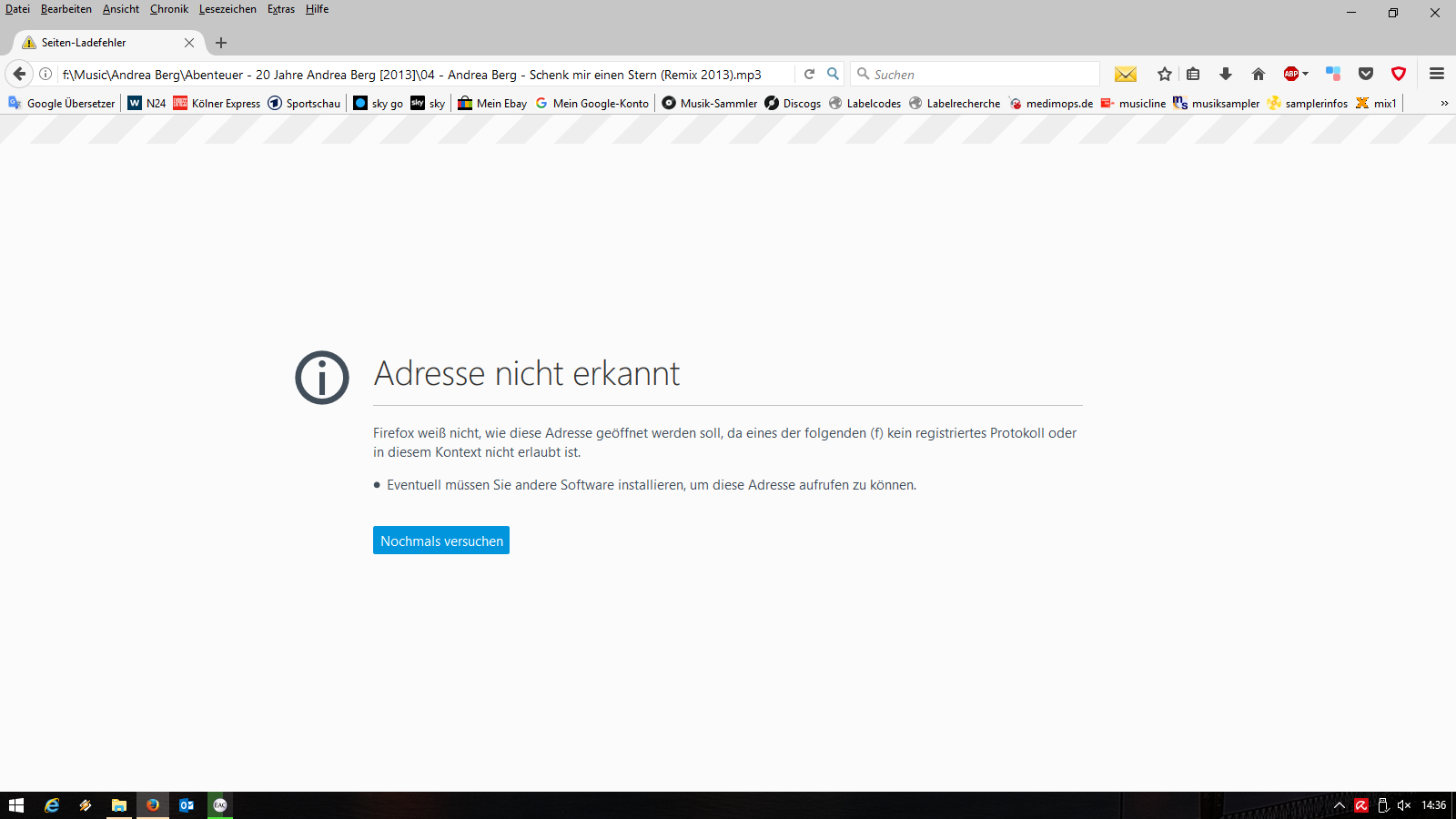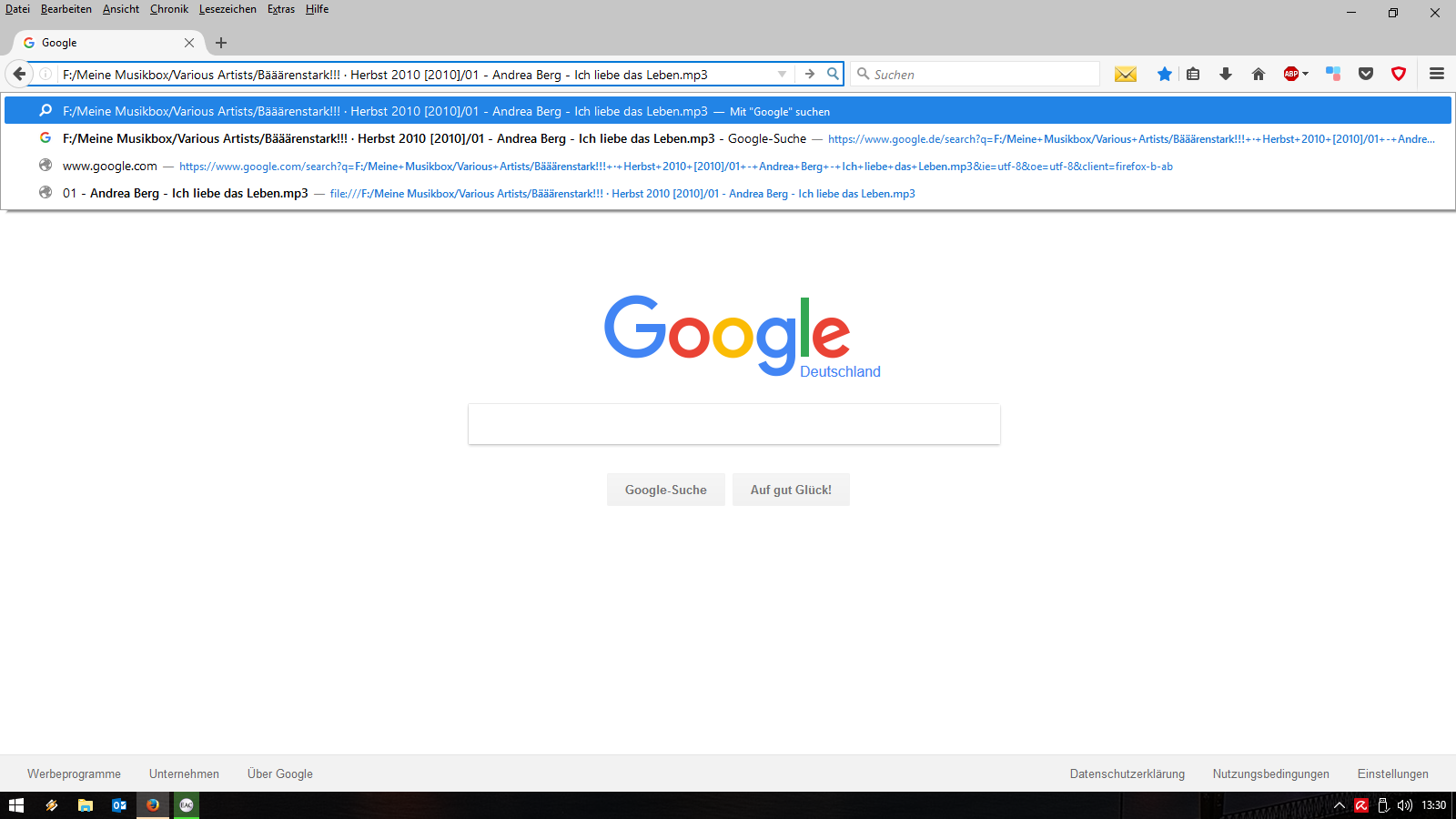 ich bin genau deiner Meinung. Es scheint immer noch so, dass es an meiner Firefox Installation liegt. Es liegt bei mir auch nicht an NoScript, denn das benutze ich nicht. Ich habe, genauso wie du in die Adressleiste den File zur lokalen Mp3-Datei eingegeben, allerdingst wandelt Firefox dies nicht sofort um, sondern es öffnet sich eine Auswahl (siehe Anhang) und erst, wenn ich auf die unten in der Auswahl angegebene Adresse klicke wird die Mp3-Datei abgespielt. Verzeiht mir bitte, dass ich mich nicht in eurer EDV-Sprache äußern kann, denn ich bin nicht mit der Sache aufgewachsen (64 Jahre alt), sondern musste mir mein Wissen erst erarbeiten.