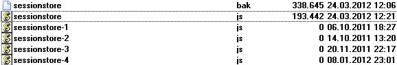 Dabei ist mir aufgefallen, dass es eine relativ große Datei namens sessionstore.js im Profilverzeichnis gibt. Die gibt es in verschiedenen Varianten: sessionstore-1.js bis sessionstore-5.js (alle haben eine Größe von 0) und eine sessionstore.bak, die sogar noch größer ist.