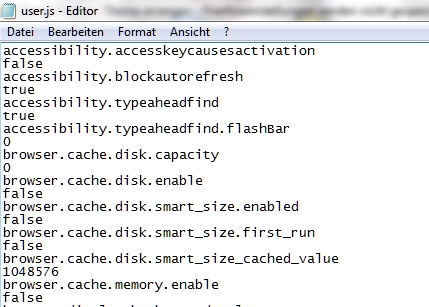 andreas: Ich habe jetzt mal versucht über kopieren die Modifikationen einzufügen. Dazu habe ich die leere user.js Datei genommen und die "Modifikationsdaten" von "Informationen zur Fehlerbehebung" über kopieren eingefügt. Wiederholtes öffnen und schließen des Browsers zeigt keine Veränderung. Allerdings sieht die user.js Datei bei mir auch etwas anders aus als bei Boersenfeger. Muss ich da vor dem kopieren noch was bearbeiten oder einstellen?