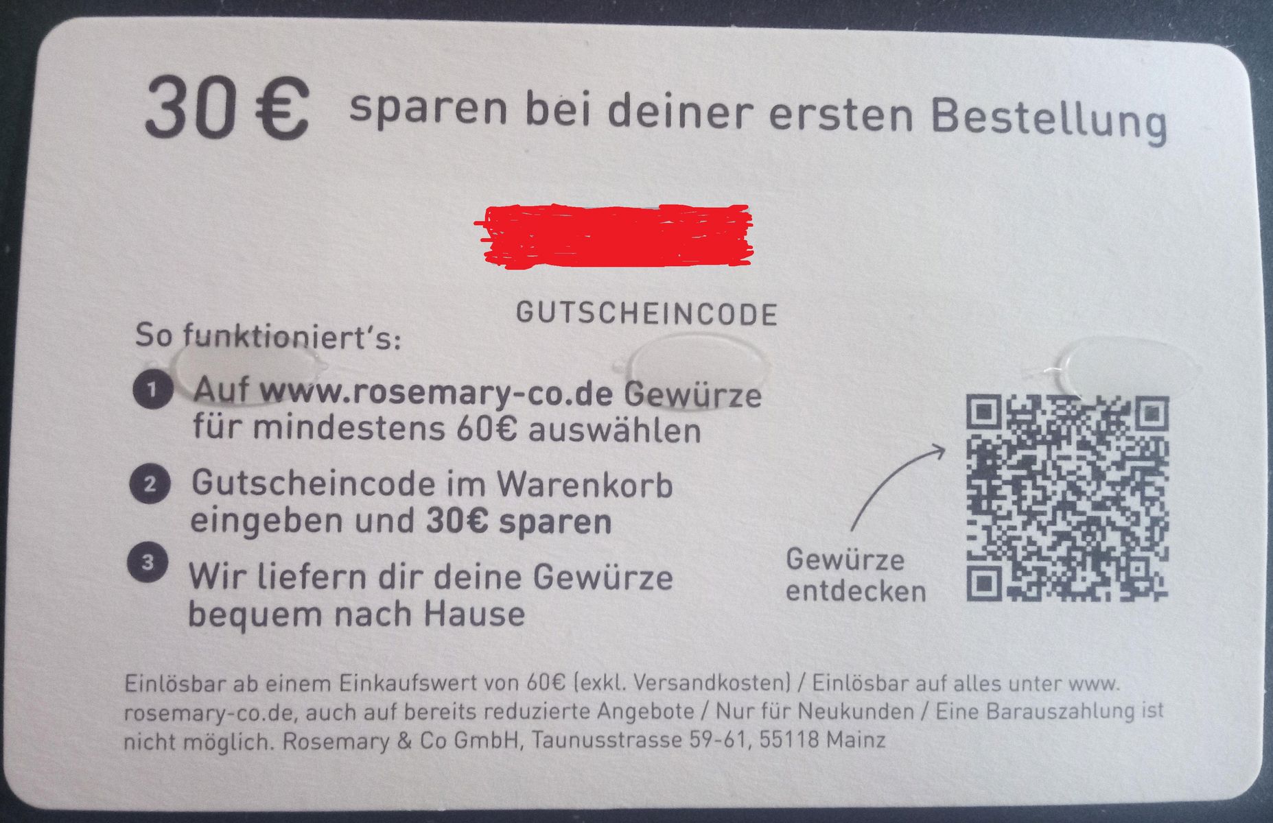 Hallo, ich habe für den Gewürze Onlineshop rosemary-co.de einen € 30.- Gutschein und kann damit nichts anfangen. Vielleicht braucht es jemand von euch, dann bitter per PN und ich schicke den Code zu.