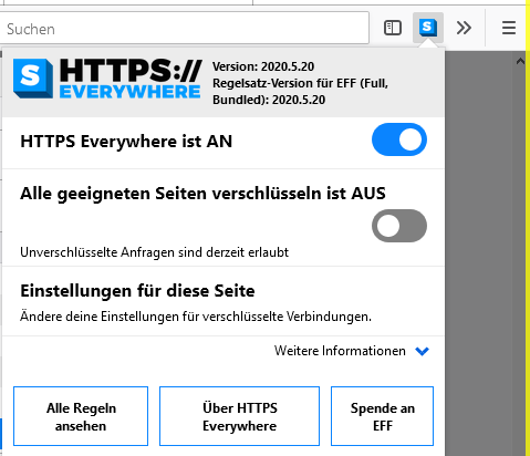 Selbst wenn man den Haken bei "Alle geeigneten Seiten verschlüsseln ist AUS" aktiviert, was aus gutem Grund nicht der Standard ist, sollte man nicht auf eine andere Seite weiter geleitet werden, sondern erst einmal das Warnschild erhalten in dieser Form