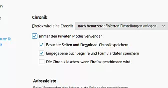 Somit ist bei dir unter Chronik --> "Niemals anlegen" angehakt und das entspricht dem Privaten Modus.