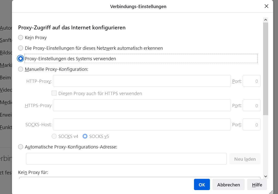 Die Verbindungseinstellung steht jetzt auf: kein Proxy