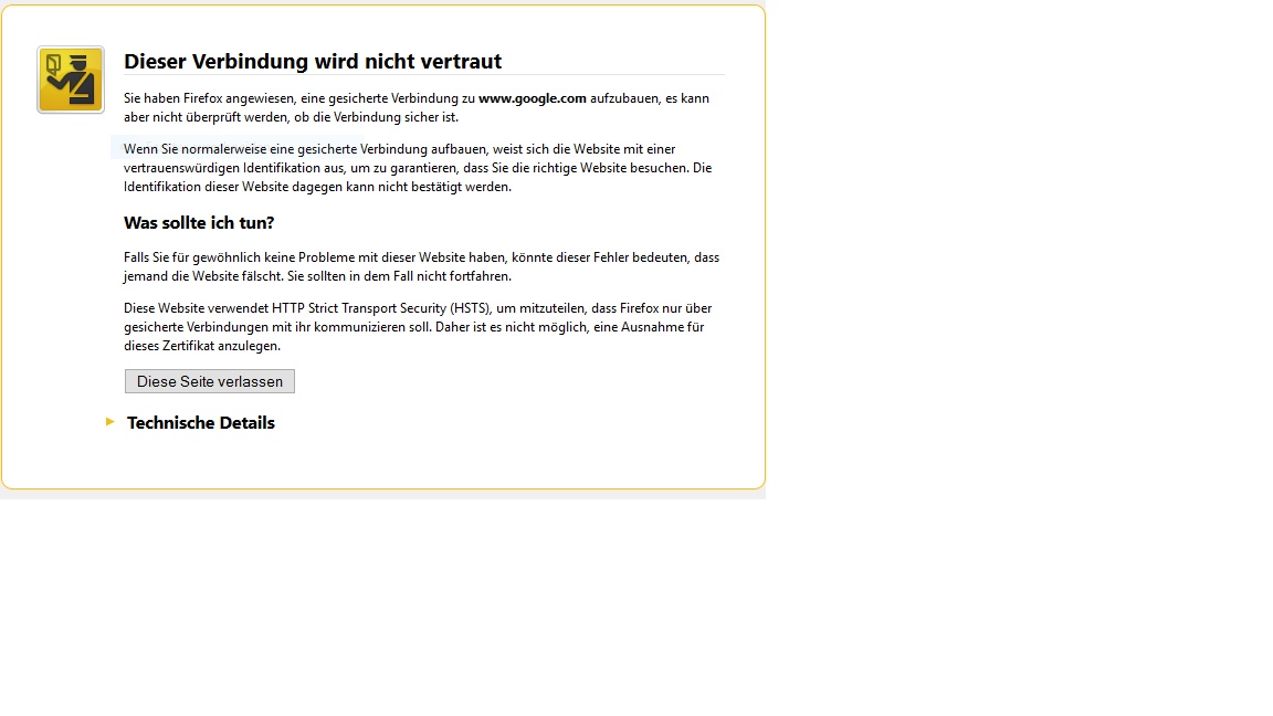 Hallo, seit neuestem kommt FF mit der Meldung 'dieser Verbindung wird nicht vertraut' wenn ich mit Google was suchen will. Das ist in meinen Augen Unsinn und ich möchte gerne wissen, wie ich das für immer, also nicht nur bis zum Neustart des FF, ändern kann.