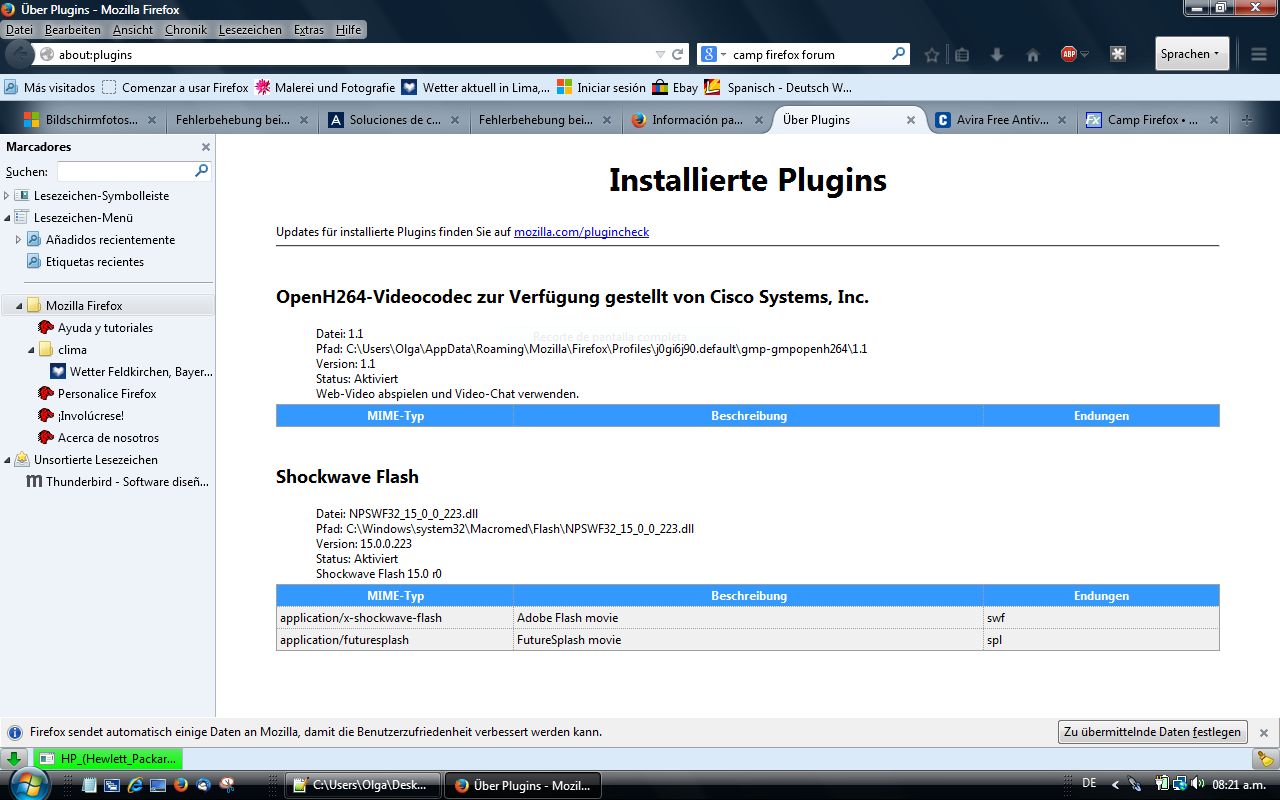 Alles anzeigenAllgemeine Informationen ------------------------ Name: Firefox Version: 33.1.1 User-Agent: Mozilla/5.0 (Windows NT 6.1; rv:33.0) Gecko/20100101 Firefox/33.0 Fenster mit mehreren Prozessen: 0/2 Absturzberichte der letzten 3 Tage ---------------------------------- Alle Absturzberichte Erweiterungen ------------- Name: Adblock Plus Version: 2.6.6 Aktiviert: true ID: {d10d0bf8-f5b5-c8b4-a8b2-2b9879e08c5d} Name: Download Status Bar Version: 12.3.0 Aktiviert: true ID: {6c28e999-e900-4635-a39d-b1ec90ba0c0f} Name: eBay-Sidebar für Firefox Version: 3.1.5 Aktiviert: true ID: {62760FD6-B943-48C9-AB09-F99C6FE96088} Name: FEBE Version: 8.2 Aktiviert: true ID: {4BBDD651-70CF-4821-84F8-2B918CF89CA3} Name: Fox!Box Version: 1.3.0 Aktiviert: true ID: {df4e4df5-5cb7-46b0-9aef-6c784c3249f8} Name: LastPass Version: 3.1.54 Aktiviert: true ID: support@lastpass.com Name: Modul zum Sperren von gefährlichen Webseiten Version: 4.5.3.8 Aktiviert: true ID: content_blocker_6418E0D362104DADA084DC312DFA8ABC@kaspersky.com Name: Sicherer Zahlungsverkehr Version: 4.5.3.8 Aktiviert: true ID: online_banking_69A4E213815F42BD863D889007201D82@kaspersky.com Name: Skype Click to Call Version: 7.3.16540.9015 Aktiviert: true ID: {82AF8DCA-6DE9-405D-BD5E-43525BDAD38A} Name: Tabs on Bottom Version: 0.5 Aktiviert: true ID: tabsonbottom@piro.sakura.ne.jp Name: Virtuelle Tastatur Version: 4.5.3.8 Aktiviert: true ID: virtual_keyboard_294FF26A1D5B455495946778FDE7CEDB@kaspersky.com Name: Amazon-Icon Version: 1.1 Aktiviert: false ID: amazon-icon@giga.de Name: Classic Theme Restorer (Customize UI) Version: 1.2.6.1 Aktiviert: false ID: ClassicThemeRestorer@ArisT2Noia4dev Name: Download Manager (S3) Version: 3.07 Aktiviert: false ID: s3download@statusbar Name: Fox Sec 7 Version: 6 Aktiviert: false ID: fx@foxysecureKDJJHVLSDUVFU.com Name: Freemake Video Converter Plugin Version: 1.0.0 Aktiviert: false ID: fmconverter@gmail.com Name: Google Translator for Firefox Version: 2.1.0.3m Aktiviert: false ID: translator@zoli.bod Name: Wondershare Video Converter Ultimate Version: 7.1.0 Aktiviert: false ID: WSVCU@Wondershare.com Grafik ------ Direct2D aktiviert: true DirectWrite aktiviert: true (6.2.9200.16492) Geräte-ID: 0x68d9 GPU #2 aktiv: false GPU-beschleunigte Fenster: 2/2 Direct3D 11 (OMTC) Karten-Beschreibung: ATI Radeon HD 5570 Karten-RAM: 1024 Karten-Treiber: aticfx32 aticfx32 aticfx32 atiumdag atidxx32 atiumdva Treiber-Datum: 12-19-2012 Treiber-Version: 9.12.0.0 Vendor-ID: 0x1002 WebGL-Renderer: Google Inc. -- ANGLE (ATI Radeon HD 5570 Direct3D9Ex vs_3_0 ps_3_0) windowLayerManagerRemote: true AzureCanvasBackend: direct2d AzureContentBackend: direct2d AzureFallbackCanvasBackend: cairo AzureSkiaAccelerated: 0 Wichtige modifizierte Einstellungen ----------------------------------- browser.cache.disk.capacity: 358400 browser.cache.disk.smart_size_cached_value: 358400 browser.cache.disk.smart_size.first_run: false browser.cache.disk.smart_size.use_old_max: false browser.cache.frecency_experiment: 4 browser.places.smartBookmarksVersion: 7 browser.search.update: false browser.search.update.interval: 31536000 browser.search.useDBForOrder: true browser.sessionstore.upgradeBackup.latestBuildID: 20141113143407 browser.startup.homepage_override.buildID: 20141113143407 browser.startup.homepage_override.mstone: 33.1.1 dom.allow_scripts_to_close_windows: true dom.max_chrome_script_run_time: 60 dom.mozApps.used: true extensions.lastAppVersion: 33.1.1 font.internaluseonly.changed: true gfx.direct3d.last_used_feature_level_idx: 0 media.gmp-gmpopenh264.lastUpdate: 1417011623 media.gmp-gmpopenh264.version: 1.1 media.gmp-manager.lastCheck: 1418214127 network.cookie.prefsMigrated: true places.database.lastMaintenance: 1418240639 places.history.expiration.transient_current_max_pages: 76888 plugin.disable_full_page_plugin_for_types: application/pdf plugin.importedState: true plugin.state.anti_banner_native_proxy: 2 plugin.state.npcontentblocker: 2 plugin.state.nponlinebanking: 2 plugin.state.npvkplugin: 2 plugin.state.url_advisor: 2 print.printer_Canon_MG6200_series_Printer.print_bgcolor: false print.printer_Canon_MG6200_series_Printer.print_bgimages: false print.printer_Canon_MG6200_series_Printer.print_colorspace: print.printer_Canon_MG6200_series_Printer.print_command: print.printer_Canon_MG6200_series_Printer.print_downloadfonts: false print.printer_Canon_MG6200_series_Printer.print_duplex: 1515870810 print.printer_Canon_MG6200_series_Printer.print_edge_bottom: 0 print.printer_Canon_MG6200_series_Printer.print_edge_left: 0 print.printer_Canon_MG6200_series_Printer.print_edge_right: 0 print.printer_Canon_MG6200_series_Printer.print_edge_top: 0 print.printer_Canon_MG6200_series_Printer.print_evenpages: true print.printer_Canon_MG6200_series_Printer.print_footercenter: print.printer_Canon_MG6200_series_Printer.print_footerleft: &PT print.printer_Canon_MG6200_series_Printer.print_footerright: &D print.printer_Canon_MG6200_series_Printer.print_headercenter: print.printer_Canon_MG6200_series_Printer.print_headerleft: &T print.printer_Canon_MG6200_series_Printer.print_headerright: &U print.printer_Canon_MG6200_series_Printer.print_in_color: true print.printer_Canon_MG6200_series_Printer.print_margin_bottom: 0.5 print.printer_Canon_MG6200_series_Printer.print_margin_left: 0.5 print.printer_Canon_MG6200_series_Printer.print_margin_right: 0.5 print.printer_Canon_MG6200_series_Printer.print_margin_top: 0.5 print.printer_Canon_MG6200_series_Printer.print_oddpages: true print.printer_Canon_MG6200_series_Printer.print_orientation: 0 print.printer_Canon_MG6200_series_Printer.print_page_delay: 50 print.printer_Canon_MG6200_series_Printer.print_paper_data: 9 print.printer_Canon_MG6200_series_Printer.print_paper_height: 11,00 print.printer_Canon_MG6200_series_Printer.print_paper_name: print.printer_Canon_MG6200_series_Printer.print_paper_size_type: 0 print.printer_Canon_MG6200_series_Printer.print_paper_size_unit: 1 print.printer_Canon_MG6200_series_Printer.prin