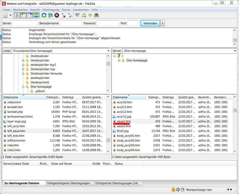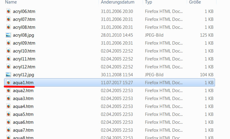 Hast du denn die Datei aqua1.htm auch hochgeladen? Wenn ja, heißt sie auch so? Nicht vielleicht aqua1.html oder aqua.htm oder aqua.html? Auch Großschreibung könnte u. U. ein Problem sein.