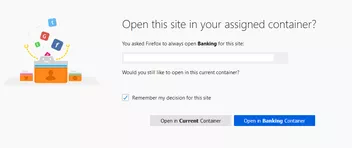 Erstens erscheint es widersinnig, dass man die Einstellung doppelt bestätigen soll: Ich habe doch schon über das Icon der Erweiterung angekreuzt, dass die besagte URL immer im Container "Banking" geöffnet werden soll. Warum wird dann beim zweiten Mal auch noch einmal extra nachgefragt?