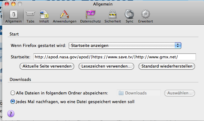Hier kann ich nur einstellen "Jedes Mal nachfragen, wo eine Datei gespeichert werden soll". Außerdem habe ich jetzt noch einen Zwischenschritt, den ich vorher nicht hatte: Ein Fenster geht auf und ich werde gefragt, was ich machen will, öffnen oder speichern, wobei ich nicht anklicken kann "Für Dateien dieses Typs immer diese Aktion..."Zitat von Mapenzi... Einstellungen -> Datenschutz -> FF wird eine Chronik nach benutzerdefinierten Einstellungen anlegen -> Chronik löschen, wenn FF geschlossen wird ->