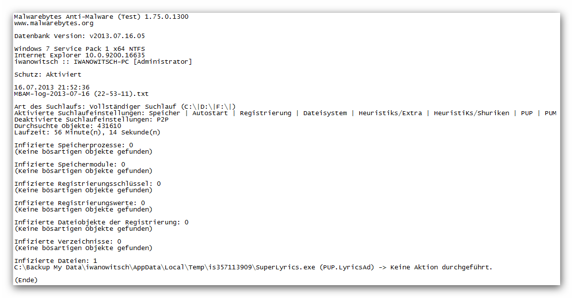 So, nach recovery hat malwarebytes im kompl. Suchlauf 1 Virus gemeldet und im Log wie folgt beschrieben: