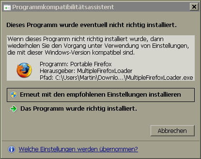 Nachdem ich, den, über die "MultipleFirefoxLoader.exe" gestarteten, portable FF, das erste mal geschlossen hatte, bekam ich allerdings diese Windows-Systemmeldung, die gelegentlich erscheint wenn Windows den Eindruck hat, daß ein Installationsprozess durchgeführt wurde, welcher eher im Kompatibilitäts-Modus ausgeführt werden sollte.