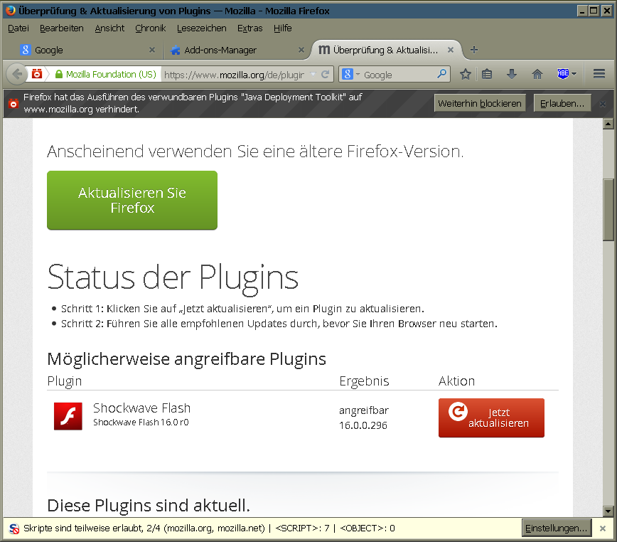 Wie gesagt scheint mir da ein logischer Widerspruch drin zu stecken. Wäre auch denkbar, daß die Übersetzung schiefgelaufen ist und/oder die Logik eines der beiden Schalter tatsächlich verdreht ist, - jedenfalls weiß ich jetzt auch nicht mehr wie sich mein NoScript bzgl. aktiven Inhalten auf HTTPS Seiten verhalten sollte.