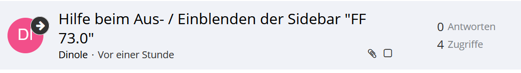 Alles anzeigentab[selected="true"] { background-color: rgb(205,69,50) !important; color: black !important; } tab { -moz-appearance: none !important; } /* Sidebar per Maushover einblenden */ @-moz-document url("chrome://browser/content/places/bookmarksSidebar.xhtml"), url("chrome://browser/content/browser.xhtml") { #menu_bookmarksSidebar { display: -moz-box !important; } #bookmarks-view-children { margin-top: -120px !important; margin-left: -15px !important; } #sidebar-header { display: none !important; } #sidebar-search-container { display: none !important; } .sidebar-placesTreechildren::-moz-tree-separator { margin: 0px 500px !important; } /* label[persist="value"][flex="1"][crop="end"][control="sidebar"][value="Lesezeichen"] { */ /* display: none !important; */ /* } */ #sidebar-box { display: block !important; position: fixed!important; top: 116px; bottom: -35px; width: 0px !important; overflow-x: hidden !important; -moz-appearance: none !important; border: 1px solid transparent !important; border-left: 0 !important; opacity: 0 !important; transition: width .2s ease-out .2s, opacity .2s ease-out .2s !important; z-index: 2 !important; } #sidebar-box:hover { width: 230px !important; opacity: 1 !important; transition: width .2s ease-out .2s, opacity .2s ease-out .2s !important; } #sidebar-splitter { display: none !important; } #sidebar { display: block !important; width: 100% !important; height: 95%; } }....und wieder mal, genau das wars. Besten Dank!!!!