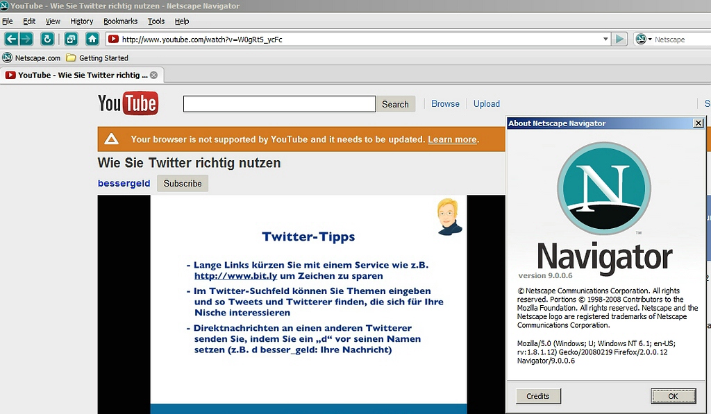 Hallo, wie gemütlich wars doch früher. Zum Beispiel mit dem Firefox 2.0 konnte und kann man heute noch ruckel- und fehlerfrei Videos anschauen.(Schnappschuß Netscape Navigator unten)