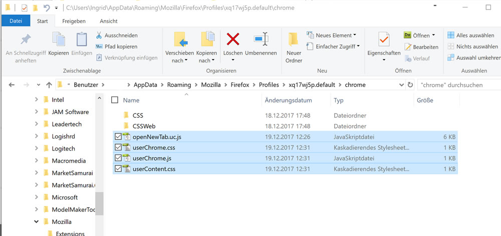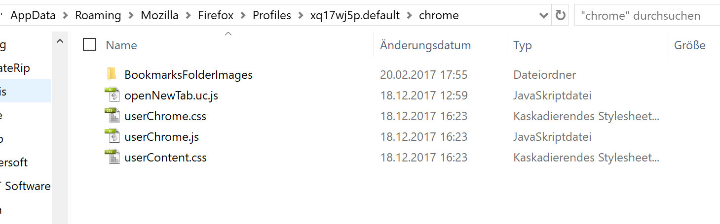 In diesem Ordner mit diesem Pfad ist gar nichts, ausser der Ordner BookmarksFolderImages und die Datei userChrome.js. Hat das mit der 64 Bit Version zu tun? Ich habe die Dateien im Ordner Programme > Mozilla Firefox abgelegt.
