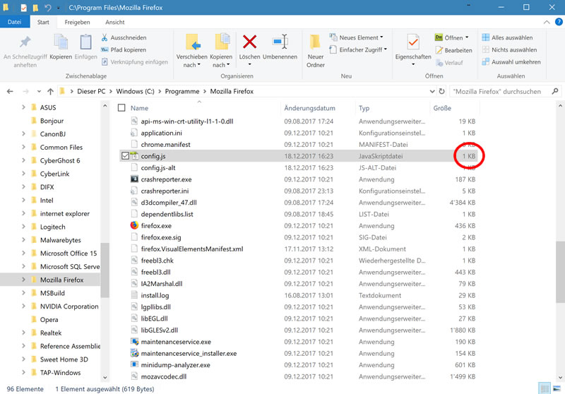 In den Unterordner \defaults\pref im Firefox-Programmordner wird die Datei config-prefs.js hineinkopiert.