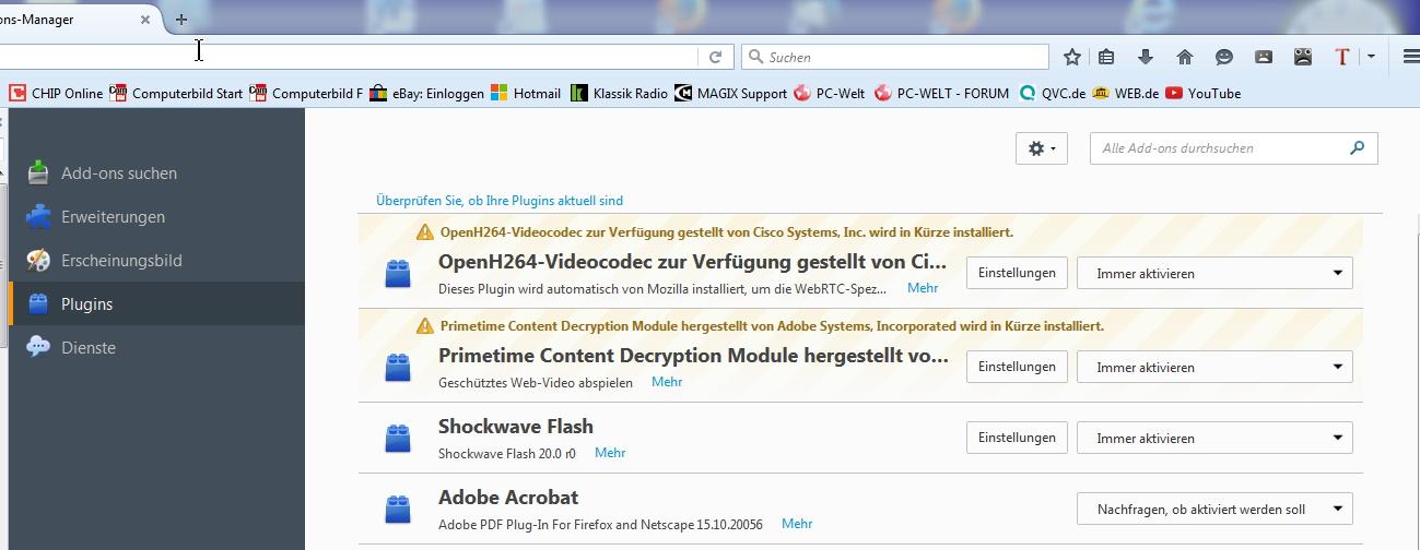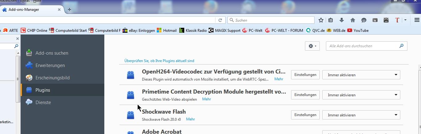 Mir ist aufgefallen das unter Extras/Add-ons/Plugins zwei Einträge nicht aktualisiert und aktiviert sind. Wenn ich das nachhole z.B. unter den bestreffenden Einstellungen und Auf Update prüfen klicke, werden die Einträge aktiviert. Das heißt sie wechseln auch die Farbe von Ocker auf Blau. Soweit so Gut. Aber nach jedem Neustart des Browsers oder von Windows ist der alte Zustand wieder eigetreten. Also inaktiv und Ockerfarben.