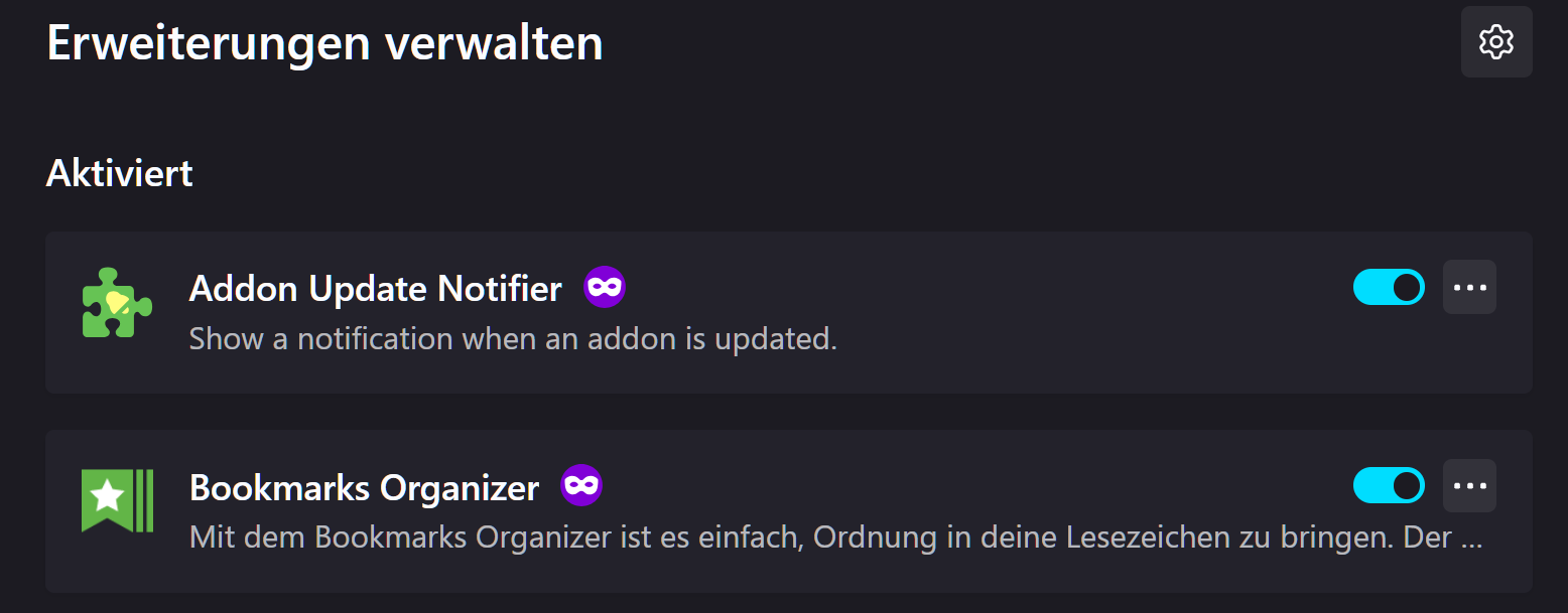 Alles anzeigen// ==UserScript== // @name addons_ver_day_updatecheck.uc.js // @description Bei about:addons beim Titel der Erweiterung Versionsinfo und // Installationsdatum hinzufügen // @update Anpassung zur Verwendung der ESM-Module mit der Dateiendung .sys.mjs // von milupo // @include main // ==/UserScript== if (typeof window === "undefined" || globalThis !== window) { this.EXPORTED_SYMBOLS = ["AboutAddonsVerboseChild"]; ChromeUtils.defineModuleGetter(this, "AddonManager", "resource://gre/modules/AddonManager.jsm"); try { ChromeUtils.registerWindowActor("AboutAddonsVerbose", { child: { moduleURI: __URI__, events: { DOMDocElementInserted: {}, }, }, matches: ["about:addons"], }); } catch (e) {Cu.reportError(e);} this.AboutAddonsVerboseChild = class extends JSWindowActorChild { handleEvent({type}) { if (type !== "DOMDocElementInserted") return; const win = this.contentWindow; const doc = win.document; doc.addEventListener("view-loaded", () => { const addons = doc.querySelectorAll(".addon-name"); for (let addon of addons) { const addonId = addon.querySelector("a")?.href.slice("addons://detail/".length); if (addonId) AddonManager.getAddonByID(addonId).then(result => { const {version, updateDate} = result; const info = doc.createElement("span"); info.style.color = "yellow"; // Erweitert info.style.fontSize = "1rem"; info.style.fontStyle = "normal"; info.style.fontWeight = "600"; info.style.marginInlineEnd = "8px"; info.textContent = `${version} - ${updateDate.toLocaleDateString("de-DE")}`; addon.insertAdjacentElement("afterend", info); }).catch(err => Cu.reportError(err)); } }); } }; } else { try { const fileHandler = Services.io.getProtocolHandler("file").QueryInterface(Ci.nsIFileProtocolHandler); const scriptFile = fileHandler.getFileFromURLSpec(Components.stack.filename); const resourceHandler = Services.io.getProtocolHandler("resource").QueryInterface(Ci.nsIResProtocolHandler); if (!resourceHandler.hasSubstitution("about-addons-verbose-ucjs")) { resourceHandler.setSubstitution("about-addons-verbose-ucjs", Services.io.newFileURI(scriptFile.parent)); } ChromeUtils.import(`resource://about-addons-verbose-ucjs/${scriptFile.leafName}?${scriptFile.lastModifiedTime}`); } catch (e) {Cu.reportError(e)} }Kann man beides, am liebsten in dem CSS-Code, vereinen?