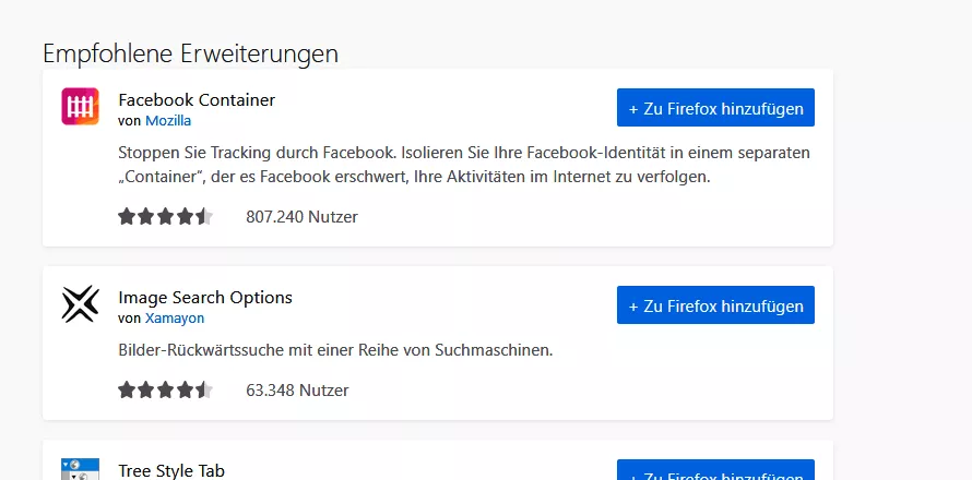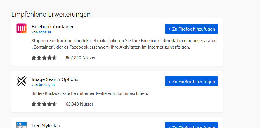 Außerdem werden mir wieder Empfohlene Erweiterungen angeboten:
